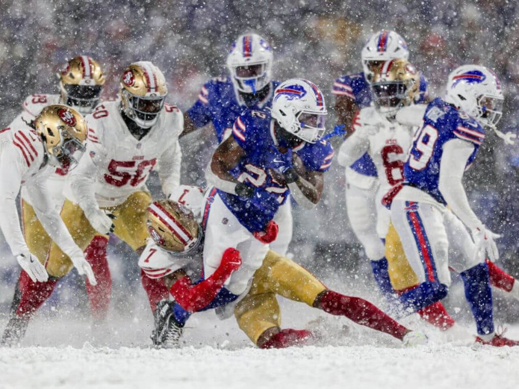 The Sunday night game in Buffalo had great snow-related visuals but the uniforms also caught my eye. I’ve gone on before about my love for Buffalo’s home uni, but don’t sleep on the 49ers road uni. I know I’m supposed to hate the Niners, and I generally do, but I think the red and gold is the best color combo in the NFL. And they’re one of the few teams whose road uni looks better than their home.