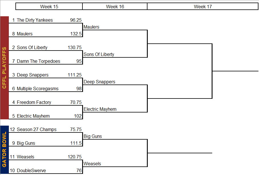 The week 15 losers plus the loser of the Gator Bowl will be sending Carl money in the coming weeks. The exception is Yankees, who won our first-ever $100 prize for winning the #1 seed. The week 15 winners plus the Gator Bowl champ will finish in the money.